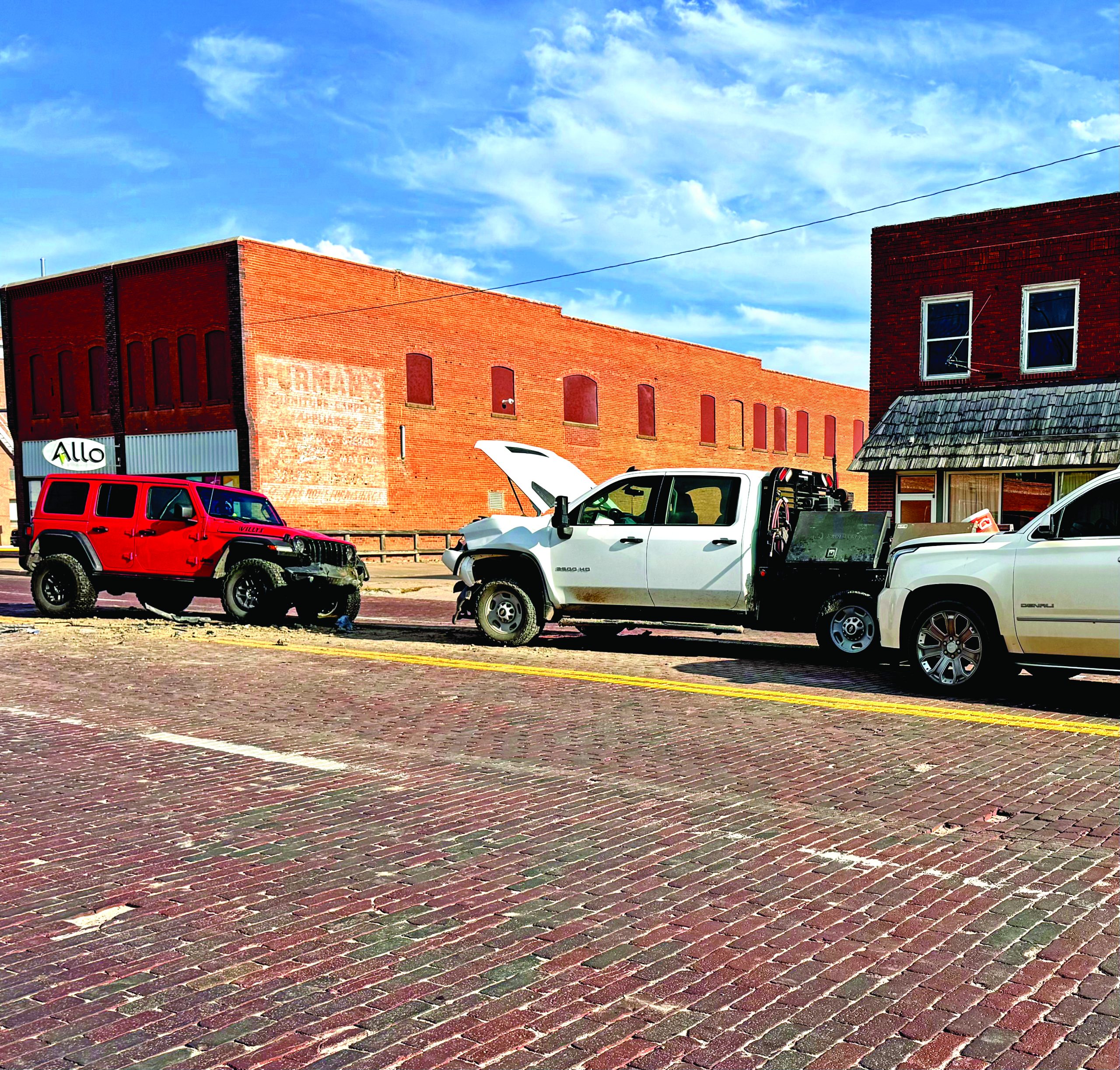 A second vehicle, a white Chevrolet Silverado, had sustained heavy front-end damage. The driver suffered leg injuries from the head-on collision with the Jeep.