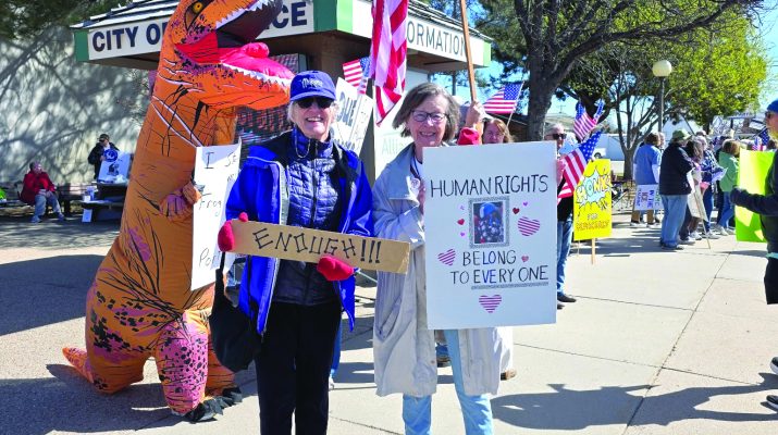 A span of generations crowded the mini-park at 3rd Street and Box Butte Avenue Saturday morning for the third NO KINGS rally internationally. About