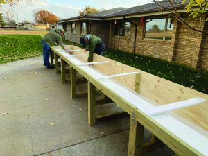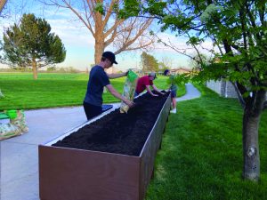Garrett visited Highland Park one day and went over the specifications for their back patio. He said he made the design and had his dad look at it. The cost was about $1,000 with most of the expense covered by donation. The planter is constructed of PVC “plywood” that won’t ever rot, he emphasized. At 22 feet wide with six slots for wheel chairs the sloped design accommodates a range of plants starting at four inches deep and running to 16 inches at the far end for deeper roots. He also built a single-slot planter for the memory support unit. “My grandma has talked to them and they like it,” Garrett said.