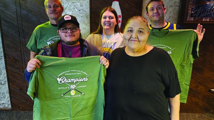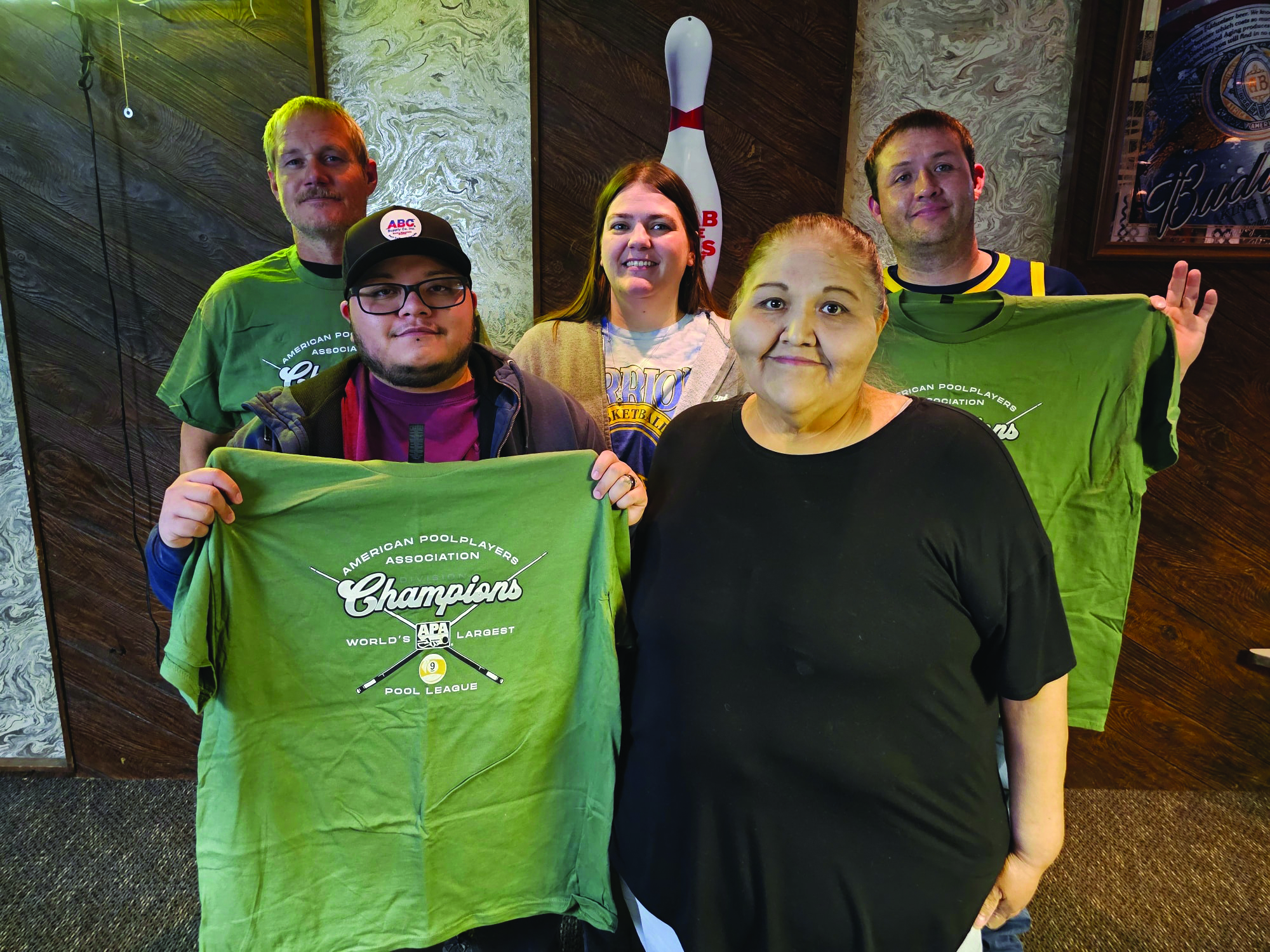 Winning the Monday 9-Ball title was “Roadhouse” out of Bowl Mor in Alliance including (photo, l to r) Marshall Sheldon, Avian Moreno, Tirah Cox, Lori WarBonnet, and Derek WarBonnet. Not shown is Vinny Moreno.