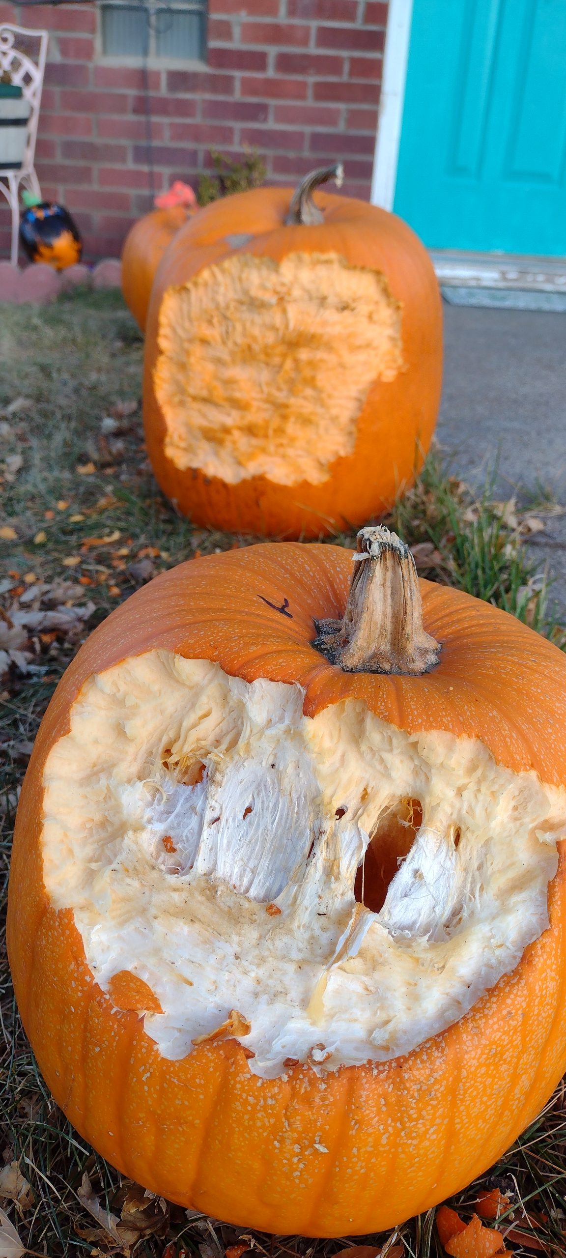 Pumpkins lined the walkway to our house until the day after Thanksgiving morning. At this point we carted off at least five of what had been nearly perfect orange orbs a fortnight before. Granted one had begun to rot, and the rest . . . let’s just say the squirrels had their Thanksgiving feast early.